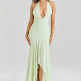 Confectionnée dans un tissu doux et aérien, cette robe révèle une allure à la fois élégante et audacieuse grâce à son décolleté plongeant en V maintenu par une coupe halter qui dégage les épaules avec délicatesse.