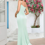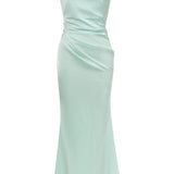Robe longue vert d’eau satinée – Élégance minimaliste & détails précieux